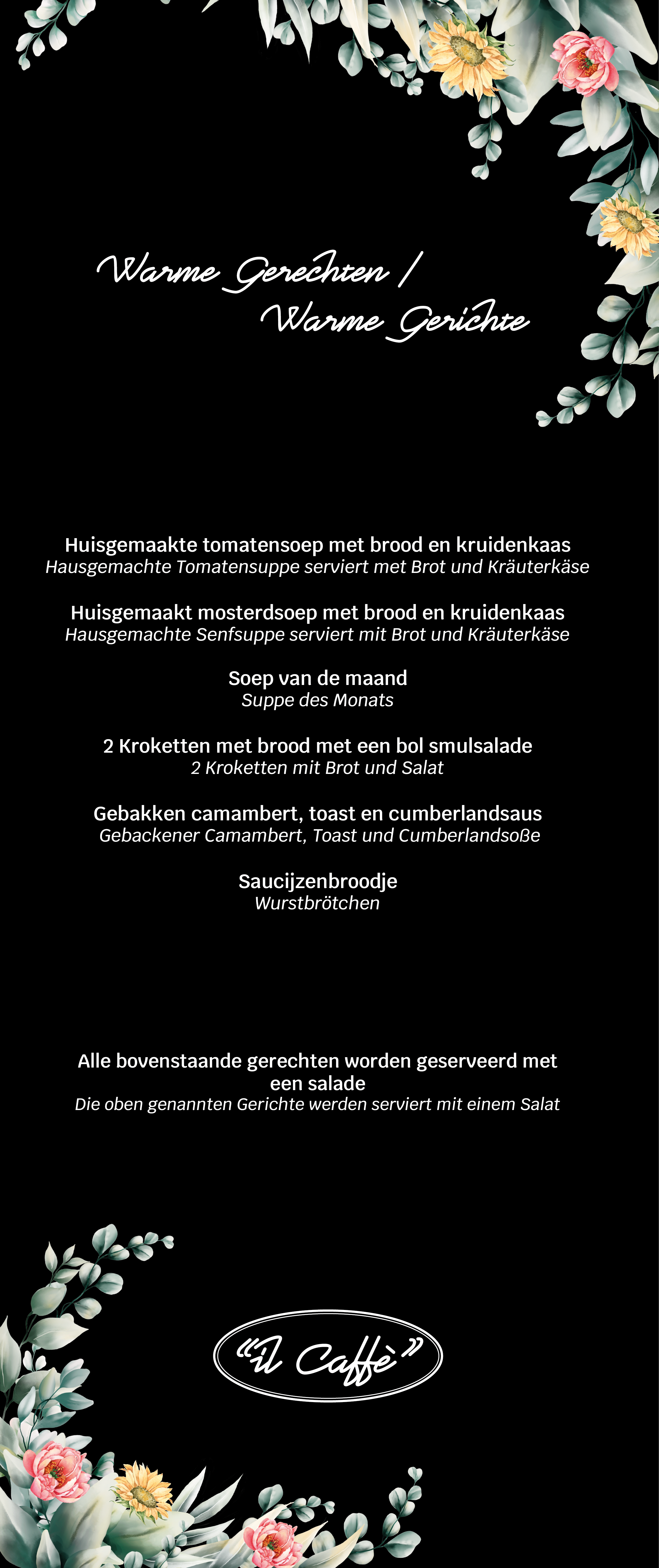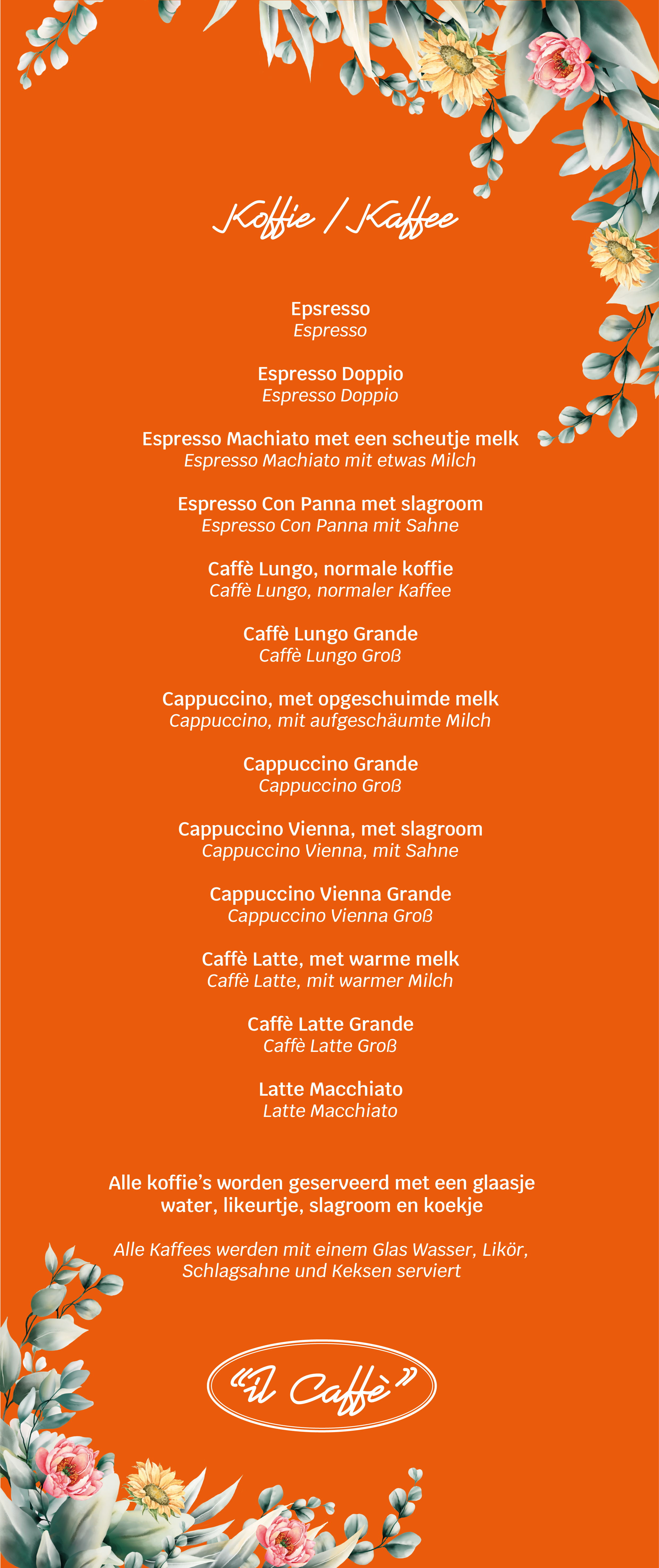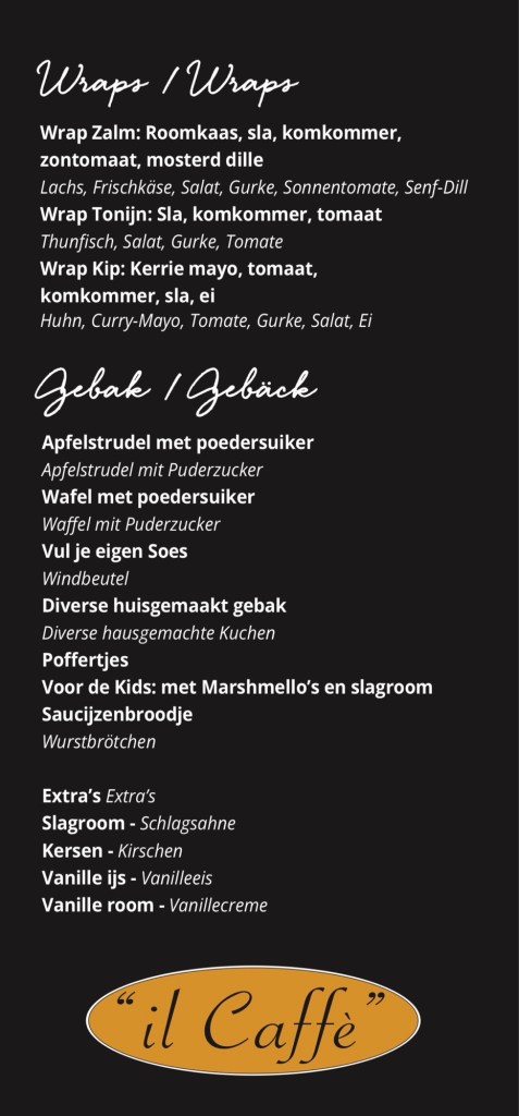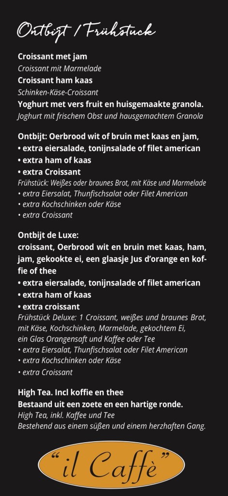 Bij ons draait het om genieten: lekker eten, goede koffie en de gezellige huiskamer sfeer. Of je nu langskomt voor een goede kop koffie, een uitgebreide lunch of gewoon iets lekkers tussendoor: we hebben voor iedereen iets. Bekijk hieronder al onze menukaarten en ontdek wat Il Caffè te bieden heeft!