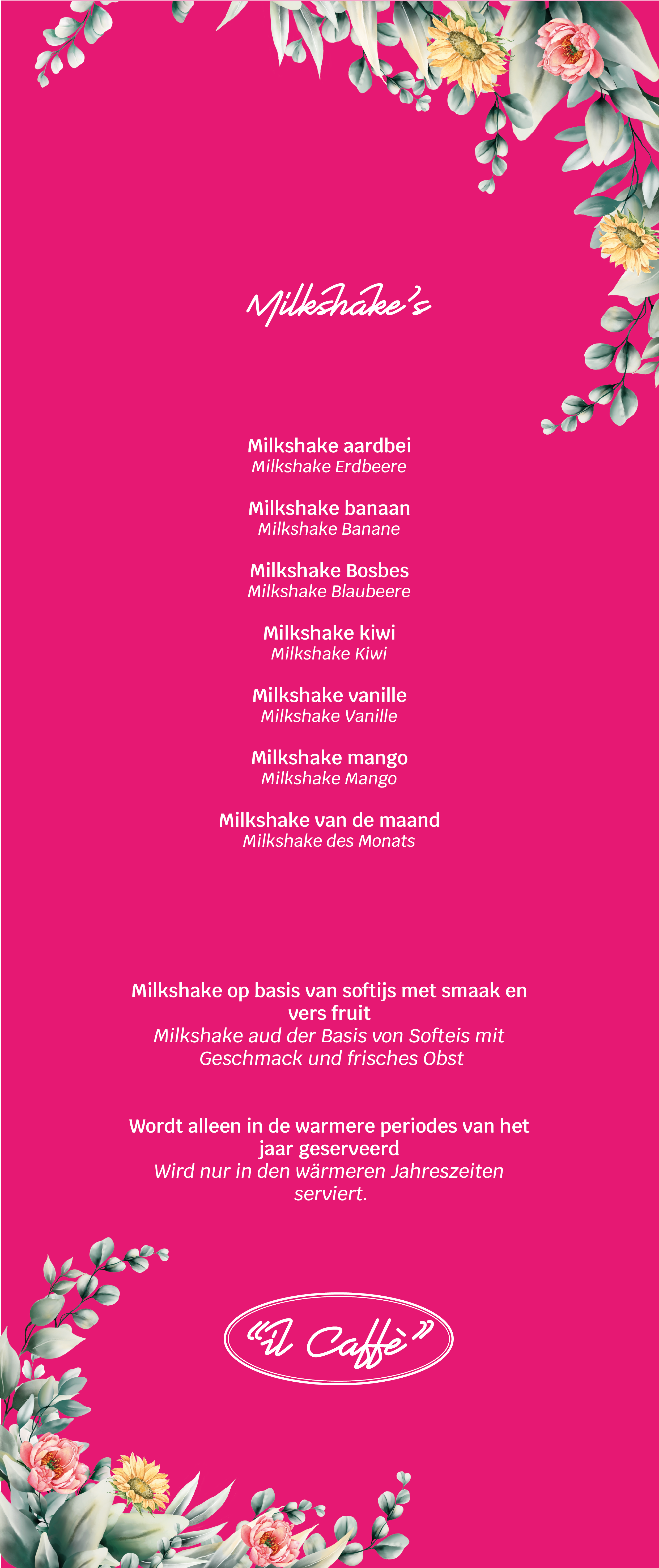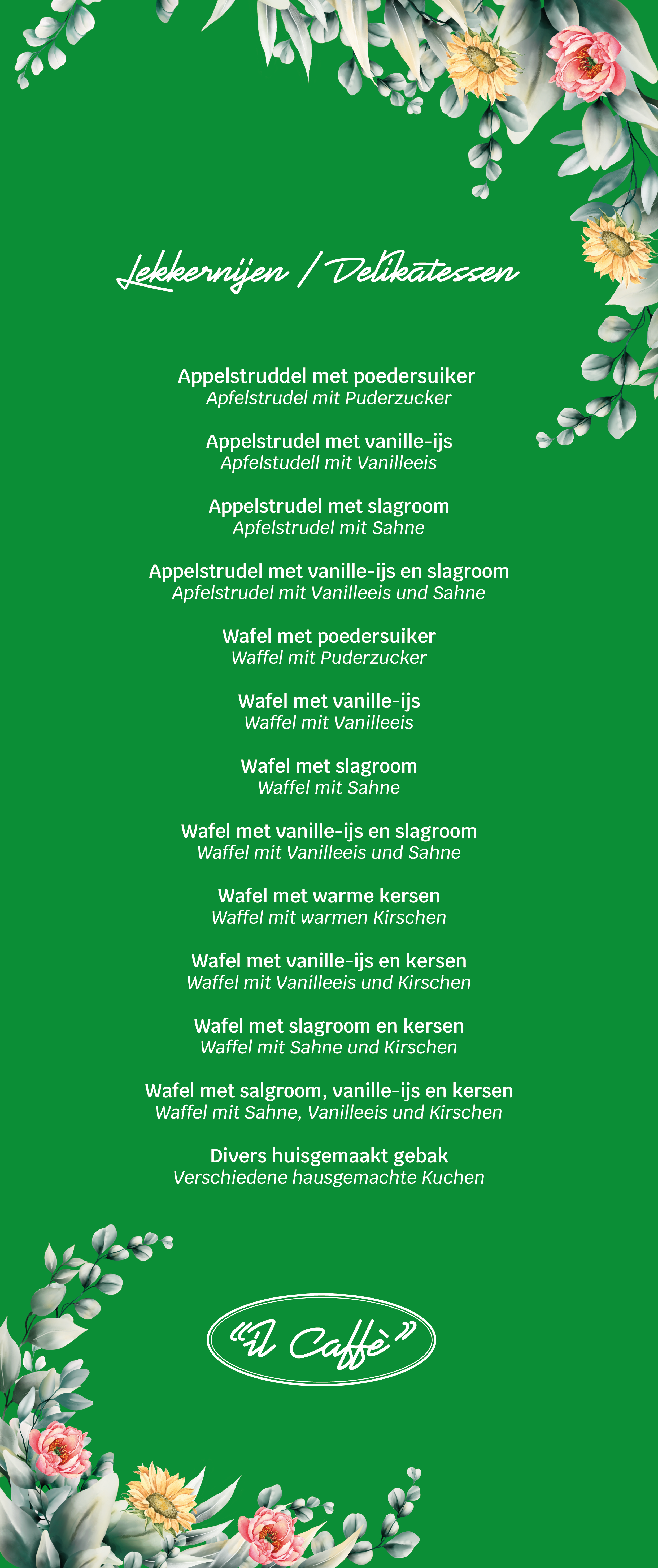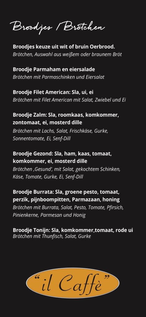 Bij ons draait het om genieten: lekker eten, goede koffie en de gezellige huiskamer sfeer. Of je nu langskomt voor een goede kop koffie, een uitgebreide lunch of gewoon iets lekkers tussendoor: we hebben voor iedereen iets. Bekijk hieronder al onze menukaarten en ontdek wat Il Caffè te bieden heeft!